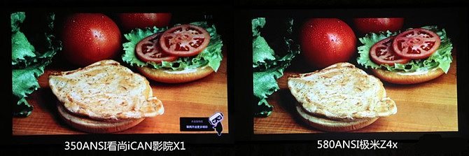 再来通过两张食物图片对比一下,极米Z4x在色彩方面偏白的情况还是存在,亮度相差了230ANSI的两台机器在同等的室内环境下,投放70寸大小的画面,几乎看不出明显的亮度差距。