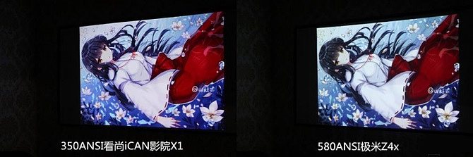 图一中:看尚iCAN影院X1的亮度是350ANSI,图二中:极米Z4x亮度是580ANSI,通过在开关灯情况下的对比发现,由于整体的流明度两台机器都不到1000ANSI,所以如果想要开灯或者白天看客观的说还是有点吃力,但是在关灯情况下我们也可以看到两台投影的效果都不错,最让笔者吃惊的是相差了230ANSI的两台机器整体效果相差不多!