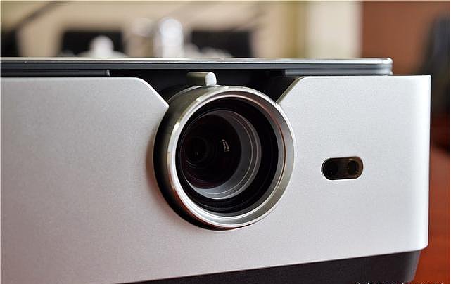 机身正面设计也很简洁,靠近右侧大大的镜头十分抢眼,采用了高品质高透光多层玻璃镜头,不仅能够有效提升画质,而且更加耐磨、耐高温,长时间使用也不易跑焦、虚焦;镜头右侧两个黑色的圆点,这是两个传感器,主要是为了配合自动对焦和上下左右±45°的梯形校正使用。