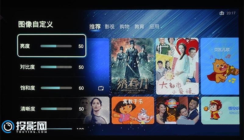 与一般家庭影院投影机相比,LCT10 0在使用上一个很大的不同之处在于其内置的阿里Yun OS智能系统,能让用户通过互联网获取海量的影视节目,甚至可以进行网上购物、游戏娱乐等等,还能安装其他的应用程序进行功能扩展,如透过阿里T V助手,让手机变成智能遥控器,使得手机上的视频、音乐与图片可以分享到投影系统之中。由此不难看出,与其说LCT100是一款家庭影院投影机,还不如说它更像一款智能化的激光超短焦投影电视系统。