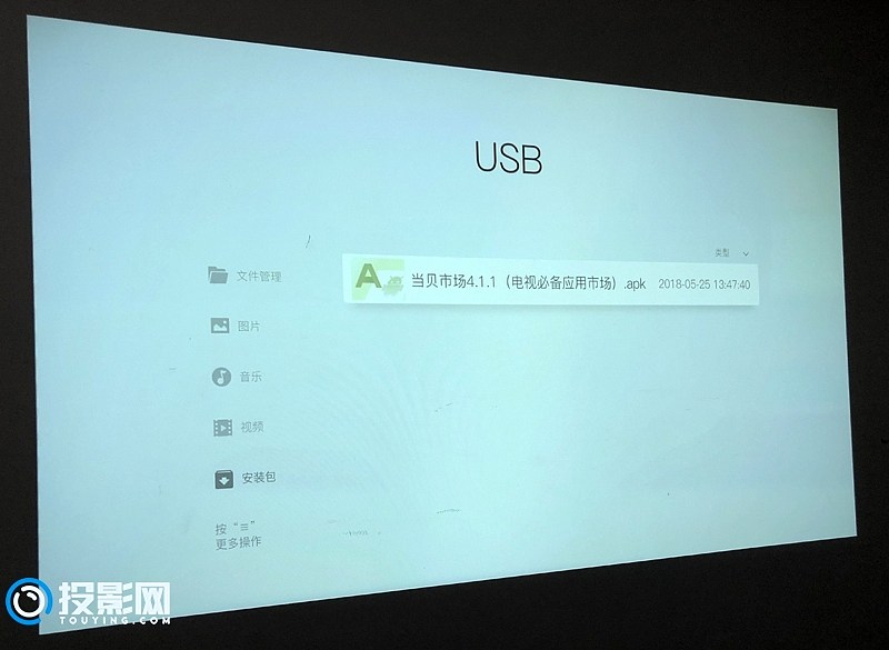 一、首先从电脑里下载好当贝市场apk(点击立即下载)并拷贝到U盘,然后将U盘连接坚果投影仪的USB接口,这时系统会检测到外接存储设备;