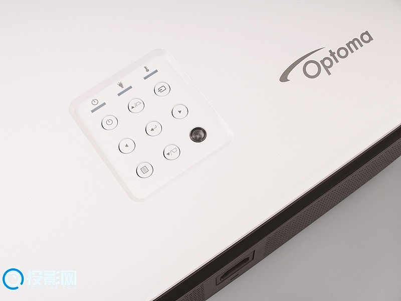 奥图码把ZH33命名为“巨匠”系列,说明了其对这款产品有着无比的信心,也给予了极大的厚望。不可否认,11999元的价格,又是拥有长久寿命的激光光源,仅仅这两点就让人对这款机器充满了期待。而见到ZH33的第一眼,我就对这款机器充满了好感,因为ZH33完全放弃了奥图码传统光源投影机的外形设计理念,而是用一种家居或者家电产品的理念在打造这款产品。设计师没有沿用传统的全黑或者全白的设计传统,而是采用了黑白双色,机身顶部和镜头部分为白色,机身侧面和机腹部分为黑色,黑白两色在机身正面用一个曲线分割。从正面观看ZH33,会有一种太极八卦图的错觉。