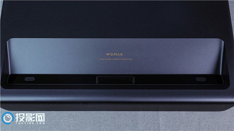 上面的凹槽处是一长条玻璃镜头保护盖,正中间是投影镜头,两侧是峰米WEMAX ONE Pro激光电视内置的人体红外感应装置,机身前能感应到55°,机身两侧能感应到70°,当调整机身位移或者小孩好奇靠近时,设备亮度会降到最低,并弹出文字“请不要直视光源,可以按遥控器任意按键退出”以示警告。