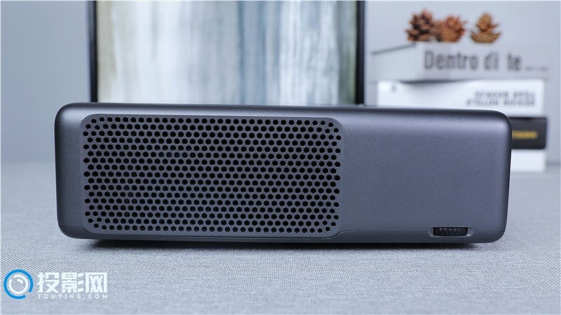 给激光电视转到右侧,右侧有个大面积的通风孔,隐约还能看到里面的两个风扇,在靠下的位置,有一个调节右侧高度的调节轮,还有个USB2.0接口。高度调节轮感觉用处不是很大,机身重达6.9kg,稳定性角度来说,有点支撑不住。USB2.0放在侧面,方便玩游戏接线,或者外接功放。