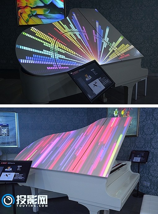 音乐厅钢琴Mapping方案,使用1台HCP-D877U-B进行钢琴投影,展示唯美光雕投影下的钢琴音乐会。