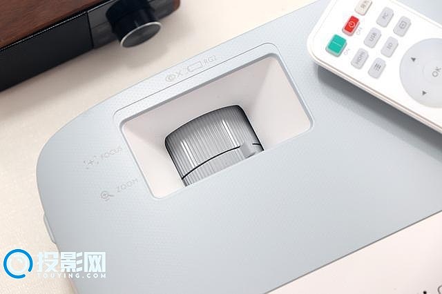 明基i705智能家用投影的顶部为操控区,采用了蓝白色拼接设计。在靠近镜头上部为使用了较为传统的调焦、对焦模式,这种手动调焦的操控方式较为经典,长久使用不易坏。按键主要包括开关机键、2D梯形失真调节、菜单键、搜索快捷键、返回键等。