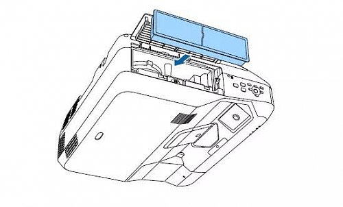 取出并更换空气过滤器 只需打开空气过滤器盖,取出已经损坏的空气过滤器,将新的过滤器装入投影机,轻轻推至卡扣到位即可完成更换工作。 不过,由于投影机内部设计非常精密,如果用户发现其他投影机零部件需要更换,切记不要擅自维修,记得联系授权服务商获取维修服务哦!