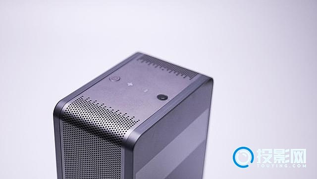 正面预留有一个玻璃小窗,3颗镜头呈45度向下倾斜,显得神秘感十足。投影仪的电源键以及音量键则隐藏在盒子的顶部,并配备了一颗500万像素的摄像头。