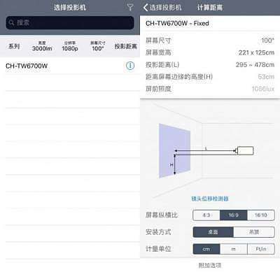 此外,如果是没有确定投影机的用户,可以点击右上角漏斗图标,在选择画面中根据需求输入亮度、分辨率、屏幕尺寸等关键信息,APP会首先推荐机型,并根据预设计算出投影距离。