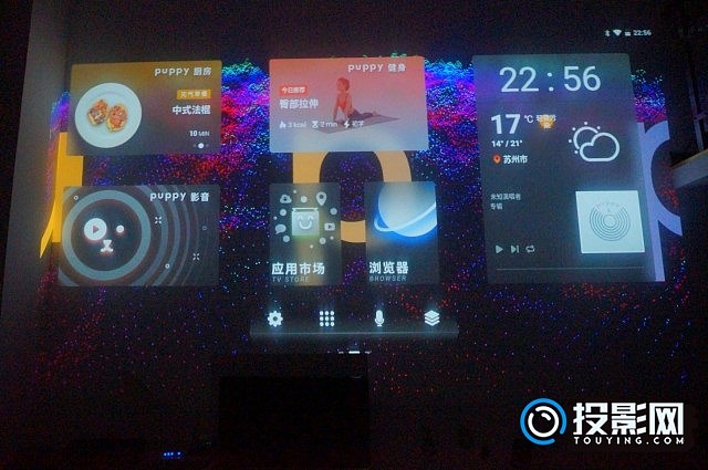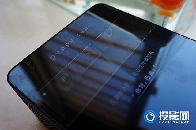当把PuppyCube横过来时,投影方式就变成了另外一种传统方式了。但是和一般的家用设备不太一样,PuppyCube是一个短焦投射设备,在比较短的距离内,就可以投射出很大的面积:1m的距离投射出来的面积大概是3.2m*1.8m,换算成英寸足足有144寸,这个尺寸还是十分震撼的。