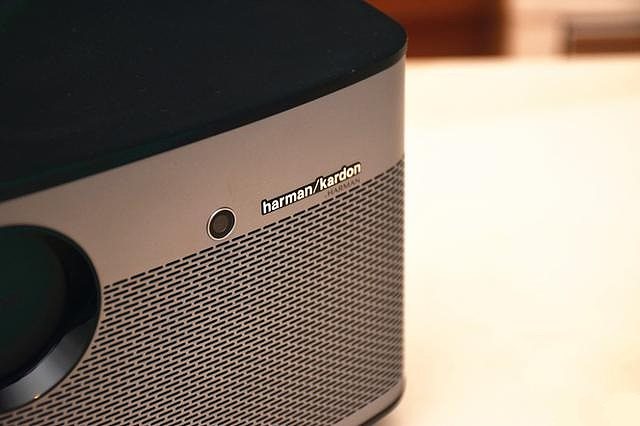 哈曼卡顿音响的扬声器单元布置在极米H2机身左右两侧,高光拍摄下隐约可见其扬声器单元。四周网状结构很好的掩饰了扬声器及散热口,让外观整体保持了一致性。左右扬声器的配合可以较好的实现360度全景声,当然相比于5.1和7.1效果差距还是很大,但相比于传统电视,传统卤素灯泡投影的音响,极米H2音质效果提升还是非常明显的。