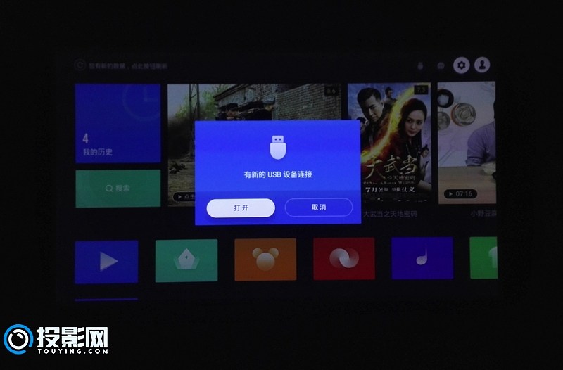 二、将U盘连接暴风Max6投影仪的USB接口,系统会自动检测到USB设备,或者在主页打开【应用管理】,进入后,选择【多媒体】—U盘设备,在U盘里找到当贝市场apk,打开并确认安装即可;