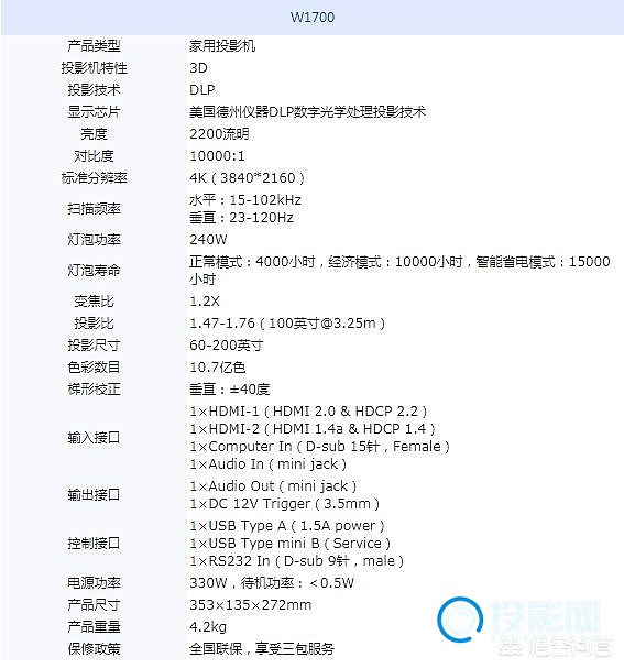 明基W1700采用DLP数字投影技术,标准分辨率为3840×2160,对比度则达到了10000:1,投影出的4K超高清画面清晰锐利。它的光源采用了传统的灯泡光源,在智能省电模式下的使用时长高达15000小时,后期的维护成本比较低。