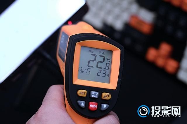 ▲温度,笔者分别将测温枪对准投影仪的发热较大部位和散热出风口进行测试。经过实测,外壳表面温度在30℃左右,最高的大约33℃,而出风口温度则只有22℃左右。笔者现在是在南京,室内温度大约在21℃左右,而小湃P1pro的这个温度控制还是不错的。主要是由于LED光源温度温度本身不是太高,加上机器采用金属框架,以及布局了多个散热孔和加装了散热风扇等原因吧。