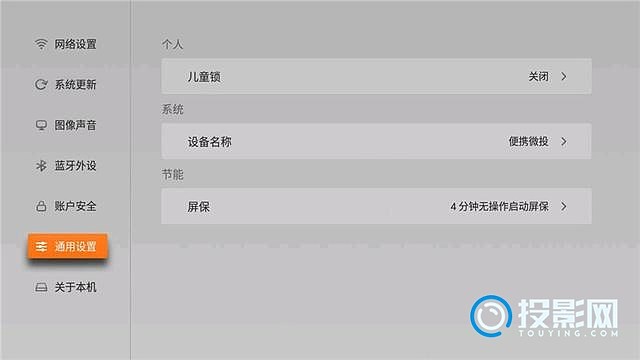 ▲通用设置,有儿童锁的开关设置。也可以更改设备名称,这个名称在投屏时会看到。也可以设置屏保时间,默认4分钟自动开启屏保。