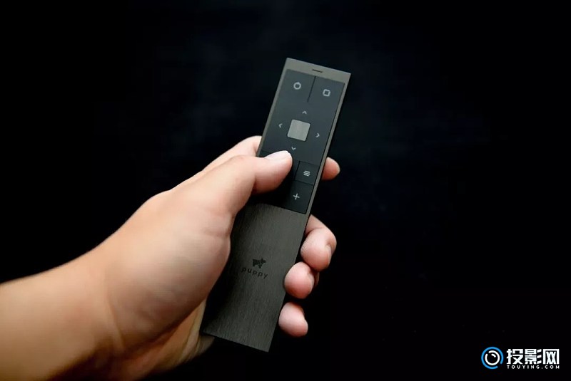 除了触控操作,puppy cube还标配了遥控器,用于不方便触控的情况下使用,比如卧投时使用遥控器对puppy cube进行控制。遥控器上的按钮也很简洁,和机身一样采用了酷炫的金属拉光表面,告别了以往传统投影仪廉价的塑料质感,很有科技感。