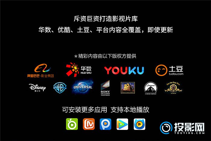 天猫魔屏A1C和天猫魔屏M1这两款便携智能微投的内置资源都是阿里影业,华数、优酷、土豆等视频平台内容全麦覆盖,及时更新,如果这都不能满足你,还有当贝市场下载更多视频软件,有网就能看电视,好内容天天更新,看都看不完。
