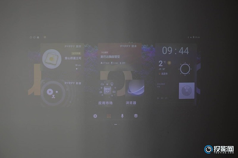 卧室其实不能算是 puppy cube 预设的使用场景,因为超短焦原本并不适合在天花板上投影;而厨房,却本就在 puppy cube 设计好的使用场景范围内,因为它的竖投模式就是为这类场景准备的。竖投模式下,puppy cube 可以投影到橱柜上,它的系统中甚至专门为进厨房准备了一套 APP,让用户在厨房中能够以触摸投影的方式跟着这套 APP 的视频学习怎么做菜。