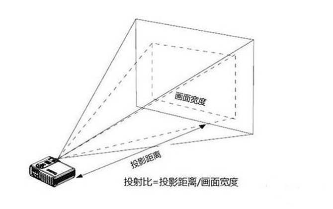 投射比其实就是投影距离/画面宽度的比值,比值越小,说明投射出相同的画面宽度,需要的投影距离越短。举例来说,假如一台投影机的投射比是1,那么用这台投影机投射出100英寸的画面就需要镜头距离幕布2.214米。 投射比就是投影距离/画面宽度的比值