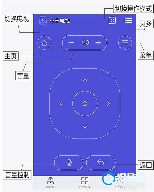 3、点击“极米投影仪”,可以看到悟空遥控的主界面,非常简洁。常见的选择键、确定键、菜单键、主页键、返回键、音量键。下方是功能选择栏。右上方分别是切换手势遥控器和更多设置按钮