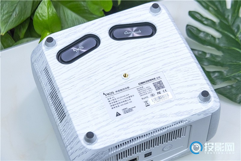 机身底部依旧采用了白色木纹设计,在四角的位置分别设计了一颗橡胶防滑垫,在居中位置则是用来固定的通用脚架螺丝口。在底部的一侧位置,还隐藏有两个低音喇叭,看上起像是一对熊猫眼。据了解这对低音喇叭的来头不小,采用的是由JBL前总裁创立的美国Crossroads音响,3层震膜设计,让其天生具备出色的重低音效果,在观看《变形金刚》《复联3》这类音效超强的电影时,的确非常震撼,临场感也很强。