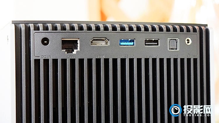 机身顶部拥有四颗实体按键,音量按键为触摸设计。背部设计主要为散热槽和接口,散热方面内置了智能静音散热系统,同时还采用独特的降噪设计。极米H2 Slim的接口非常丰富,电源孔、LAN、HDMI、USB3.0、USB2.0、SPDIF、音频孔,这些接口足以应付大多数场景,而大多数用户只需要接入电源线就足够了。