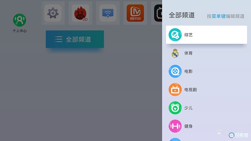 如果各位对“综艺”比较喜欢我们就可以按住遥控器的左键,直到出现图中的标。“箭头”是把这个模块移到第一位的意思;“圈”是删除的意思。