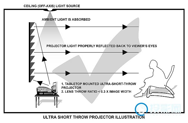 罗杰斯解释说,这种纤维结构是屏幕材料的核心,例如Elite的StarBright CLR,其中这些反射微结构被对齐以将从UST投影仪向上传播的光直接转移到观察者的视野中(如下图所示)。同时,这些专用屏幕拒绝其他形式的轴外光,包括普通室内灯,窗户灯,尤其是天花板灯。他补充说,反射表面甚至可以将来自“标准投影”投影仪的光线引导远离观察者的视野。