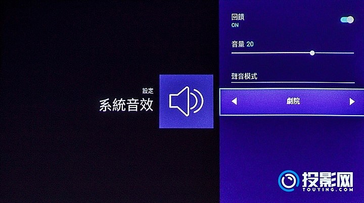 系统音效部分,理所当然就是针对声音表现,所以可看到声音模式的设定项目,由于GV1所配置的音响系统,经过精密的调整,所以实际上无论观看电影或是聆听音乐,都可以听见相当清晰且动感的声音表现,对于一款强调影音娱乐的微型投影机来说,绝对是灵魂所在之一。