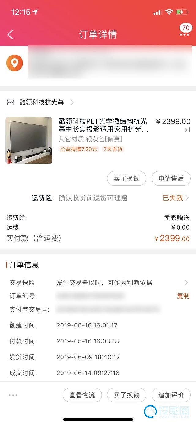 下单以后,经过一段时间的等待,幕布终于到了。说真的兴奋感和期待感非常高。跑到物业把快递扛回来。为什么要用到扛呢?因为很重,包装也大。用料非常扎实,扎实到我拆了箱子以后发现我自己根本装不上。又打电话摇了俩人过来。这里要说的是,卖家提供了安装服务,不过我想体验下自己安装的快感,所以没用。自己安装完以后,卖家退了169块安装费,美滋滋。