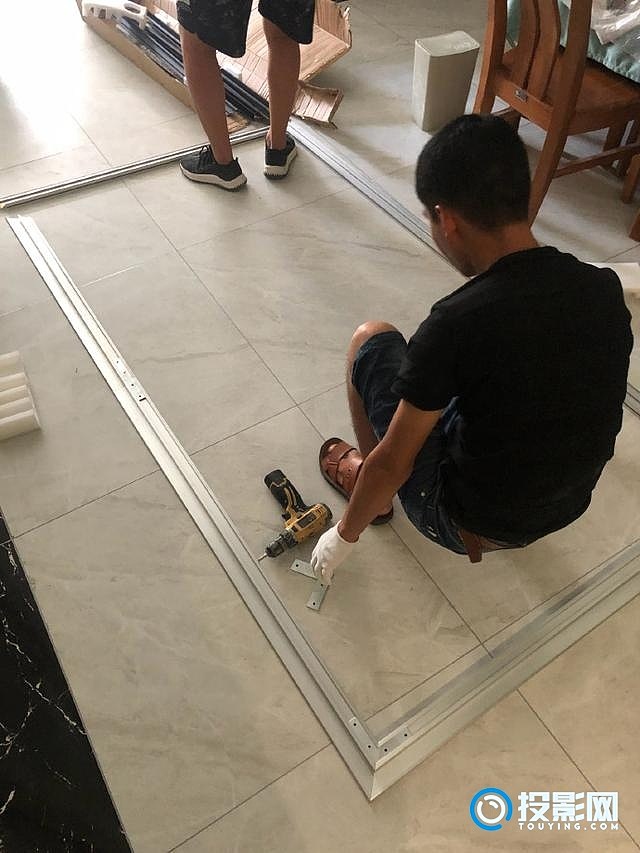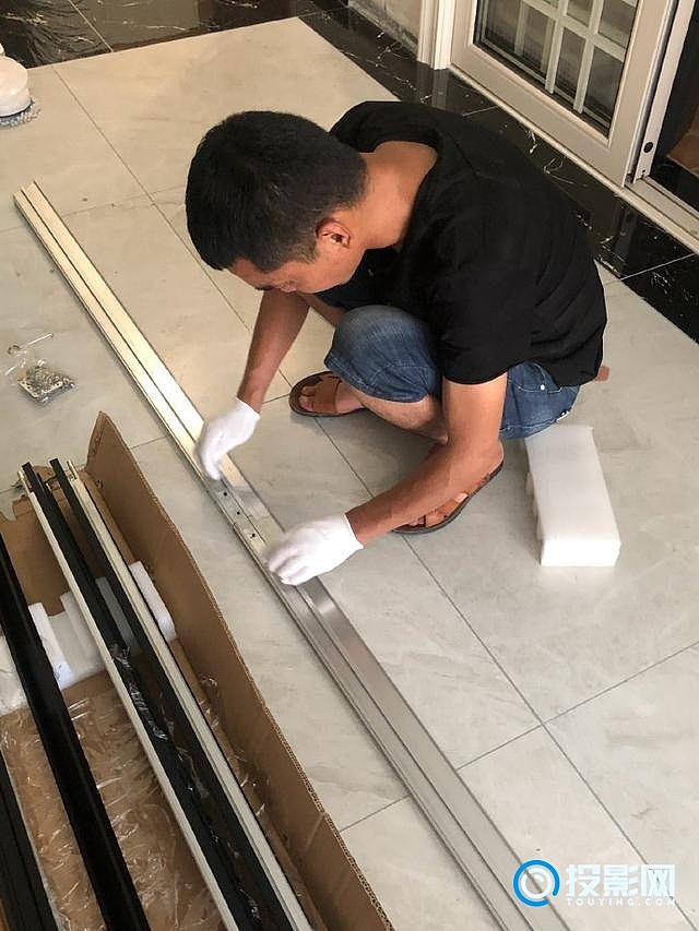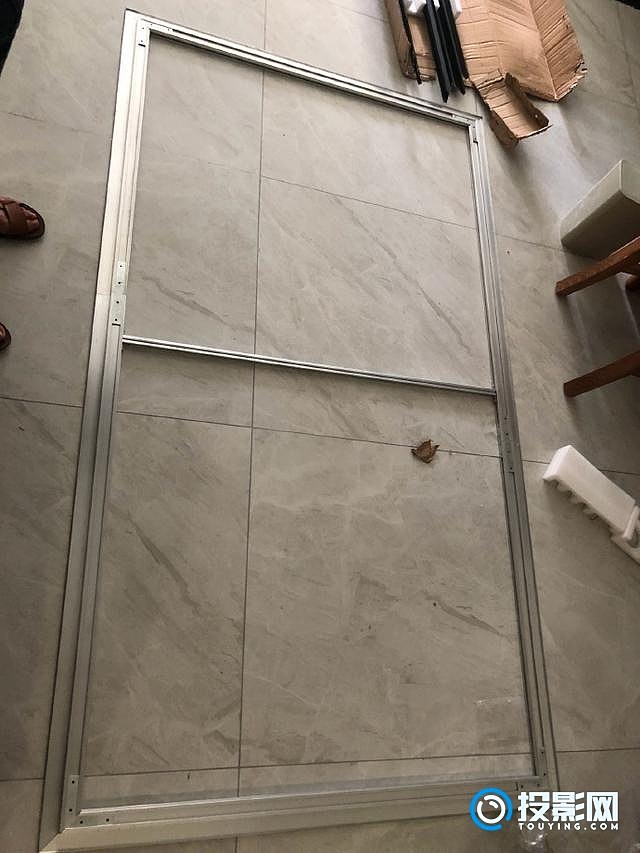 自己安装其实也很简单,先把铝合金的内框架组合完成,卖家给了足够的连接件,稍微有点动手能力就可以完成。装好外框架以后,把地扫干净,框架放一边,开始铺幕布。