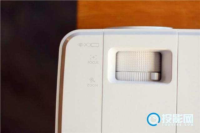 在投影仪的上侧有一个物理按键区域,包括:电源键、菜单键、信号源键以及返回键,因为有遥控器所以这些按键一般很少能用到,这样的设计是为了防止遥控器突然没电也不会影响投影仪的正常使用,并不算多余,在按键区的左侧靠上有着调焦旋钮以及对焦旋钮,可以通过二者的配合将投影画面清晰的展示出来,调焦比为1.1X。