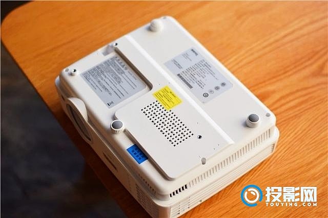 在投影仪后侧有着丰富的连接口,市面上流行的HDMI接口、USB接口、VGA接口统统都有,在连接上满足你的需求,除此之外还有WiFi接受线口以及电源接口,在投影的底部有三个螺丝孔用以吊装使用,还有三个三个防滑垫用以将投影固定在平面上以便使用,其中前面的防滑垫可以进行高度调节。