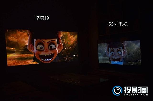 首先需要说明该对比效果是在同屏幕下实拍,由于相机的测光点不同,可会产生与肉眼所见的一定差距,尤其途中电视实际亮度并没有图片中这么低,由于坚果J9在55寸吋画面下亮度比较强,所以显得电视机画面较暗,实际,电视背景亮度已经调到了最高。而图中亮度差主要为展示1850 ANSI流明亮度的坚果J9投影与普通电视55吋寸画面下的亮度差距。
