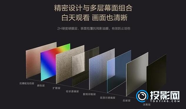 DNP是一家来自日本的公司,极米这一次正是看中了DNP公司的抗光膜片技术。除了DNP抗光膜片之外,极米还选择了多层其他材质和功能的幕面,将其采用一体式贴合技术融合在一起之后,便有了我们现在看到的DNP抗光硬幕。