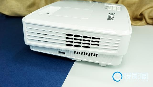 镜头的右下角是红外线遥控信号接收处,正常使用时请不要遮挡。至于BenQ LOGO下方的XGA标识,说明了此款投影仪主打1024X768(4:3)分辨率。一般来说商用机都是XGA设计,因为此分辨率适合用于文字与图片演示。当然与现今动辄1080P、4K分辨率的比起来,XGA自然不适合用于挑剔的娱乐观影。可毕竟款商用机,优选XGA的性价比准没错。