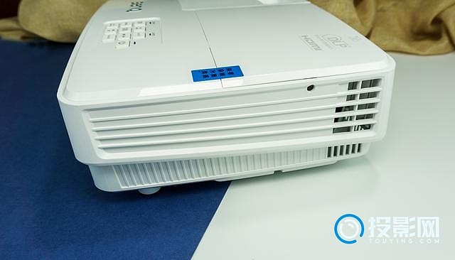 主机面板的按键均集中在右下区域。比如开启投影仪、梯形校正、音量调节、ECO BLANK开启、信号源选择等。虽说不如遥控器上的可选项多,但通过这十个按键,我们也可以对投影仪进行一个基本的控制。另外,在按键的四周设有3枚LED灯,如果投影仪出现故障,可以通过指示灯判断是哪方面出现问题。