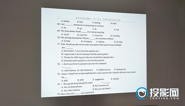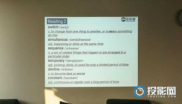 在室内开灯的环境下,白墙的效果相当不错。文档的字体相当清晰,白底色也很亮。 XGA的优势就在于可以正常的投影出文档的画面,两边不会用大黑边填充。如果觉得此时的文字过小的话,还可以使用投影机的数码放大功能。