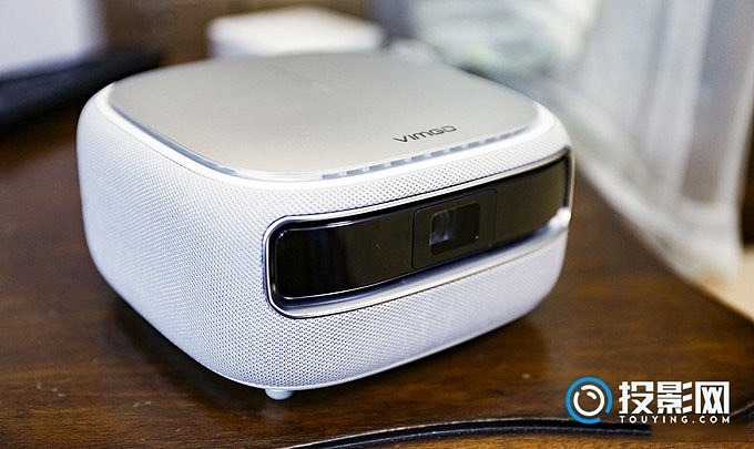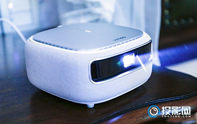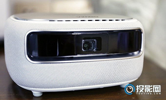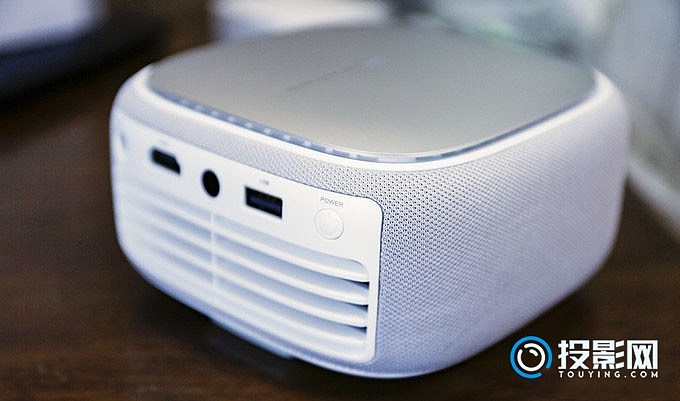 机身正面其它部位和侧面都采用的是针织面料与金属边框搭配的方式,营造出了温馨高档的质感,这样的设计,还能使机器起到更好的散热作用。在针织面料下隐藏了2枚高品质扬声器,能提供立体环绕音响真实还原临场音感。实际使用其音质效果不亚于平常家用的独立音箱,音质个人感觉超出了我的期待,语音清晰,氛围感强,4-5人观影完全没有问题。