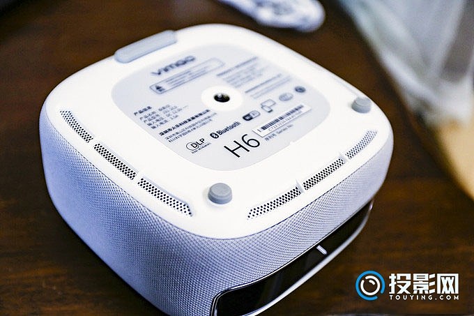 微果H6的整机呈扁平立方体,颜色偏向灰白色,顶盖采用了ABS镀金属膜的工艺,不易留存指纹,机身侧面采用的是声学针织面料与高档音响的面罩类似。