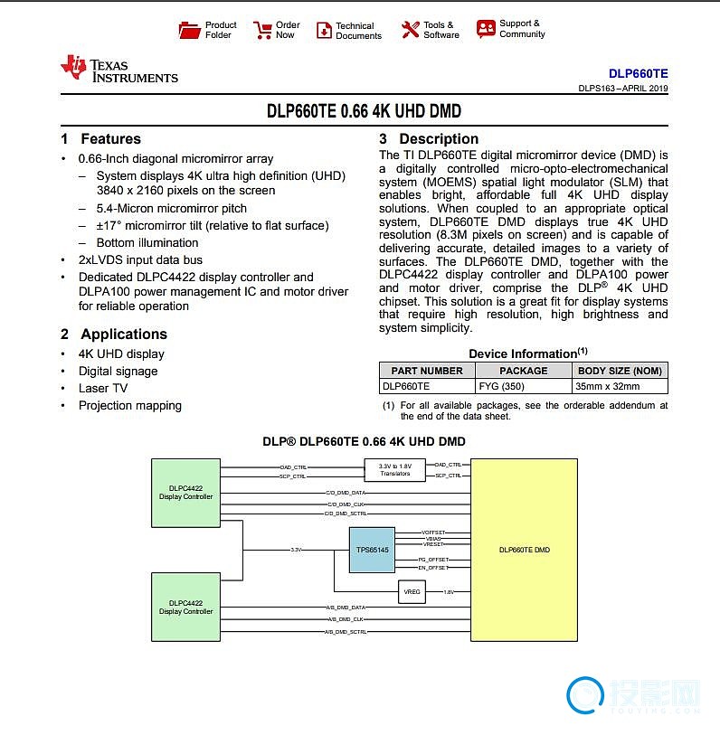 0.66寸DMD 4K,这块DMD芯片和上面的0.47寸DMD 4K一样,也是面市时间也不长,同样是利用XPR技术实现的4K,但是它原始分辨率达到了2716×1528,只需要抖2次就能实现4K。TI官网能查到这个尺寸的DMD型号只有一个:DLP660TE,设计最大流明支持到5000流明,目前采用这个DMD的家庭影院投影机基本都是中高端型号,奥图码的880就是采用的这个DMD,激光电视方面,海信L7用的也是这块芯片。