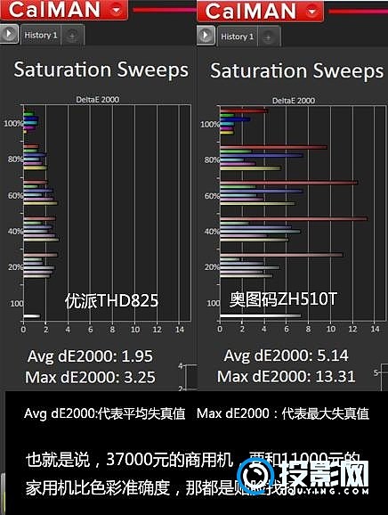 上同的柱状图代表失真,越长表示失真越大。上图左边是11000元的优派THD825,而右边就是奥图码ZH510T。