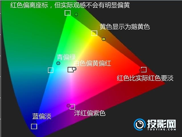 当色彩落点往哪个方向偏,投影机的颜色表现就会往哪个方向偏。