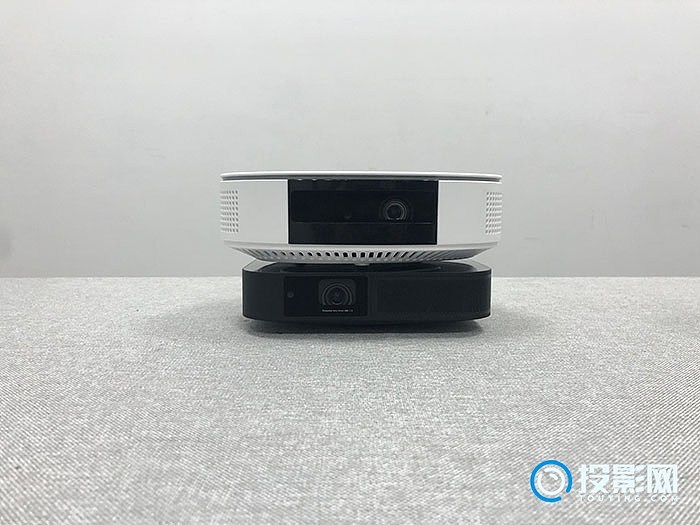首先来看一下两款投影仪的外观,极米Z6X和当贝D1的外观很容易分辨,当贝D1的外观设计更大,而且是一个三圆角的设计,以白色为主色;极米Z6X相对来说更为小巧,正方体的设计,以黑色作为主色,机身的logo和标识都采用了金色点缀。
