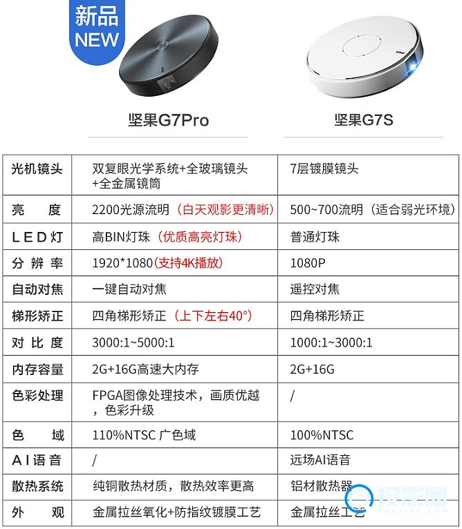 坚果G7Pro与G7S在对比度上也存在着不同,坚果G7Pro的对比度达到3001~5000:1,G7S的对比度是1001~3000:1,两款投影仪的对比度几乎不在一个等级;且在色域上所能达到的范围也略有差异,坚果G7Pro色域在110%NTSC,G7S色域略低,在100%NTSC;还有色彩处理上,坚果G7Pro配有FPGA图像处理技术,所以画质的颜色效果依然会是坚果G7Pro的更好。