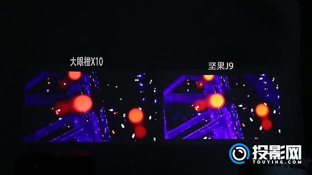 接着我们在两部投影仪上投影同一张图片,放大细节后,在画面中可以很明显的看出,左边大眼橙X10投影的画面中,红色灯球的色彩要比坚果J9所展现更加艳丽,整体的色彩几乎与原图片保持一致。然后再来看坚果J9,坚果J9所投影的画面整体色彩与原图稍有差距,原本的红色灯球在画面上所展现出来的颜色更接近于明黄色,由此可见,其色彩还原度还是要稍逊大眼橙X10一筹。