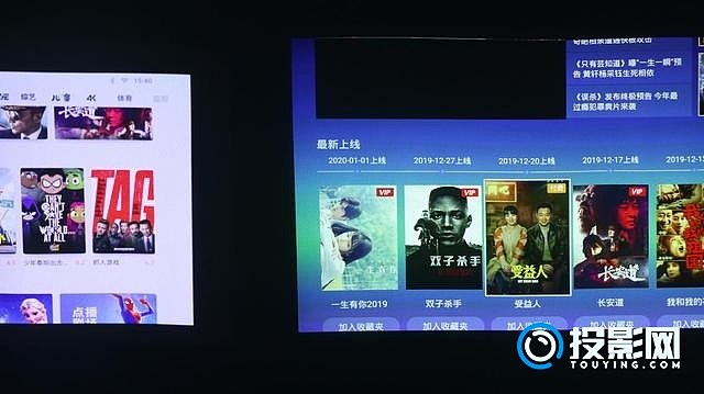 先来看一组播放电视剧的画面,两部投影仪播放的画面和投影的分辨率是保持一致的。左边的是大眼橙X10的播放画面,右边是坚果J9的投影画面。在画面上可以很明显的分辨出来,坚果J9的整体画面泛黄,暖色调调校似乎有些用力过度了。反观大眼橙X10的投影画面会更加自然,整体色调也比较和谐,既不会偏冷泛蓝,也没有坚果J9画面泛黄的毛病。