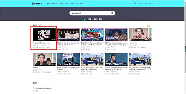 3. 在搜索框中输入“One World together at Home”或“一起为世界加油”,即可找到演唱会视频。