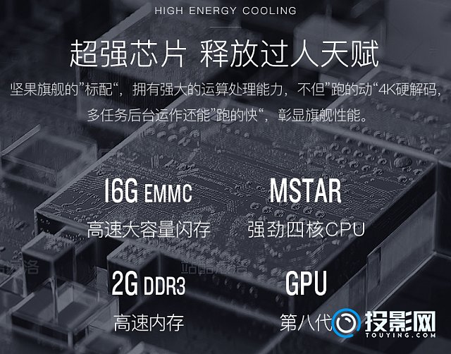 坚果J7S采用处理芯片是Mstar6A838,拥有四核A53架构64位CPU,第八代GPU,是一款相当不错的处理芯片,不过随着当贝投影采用的Mstar6A938处理芯片的出现,让坚果J7S的处理芯片逊色不少。