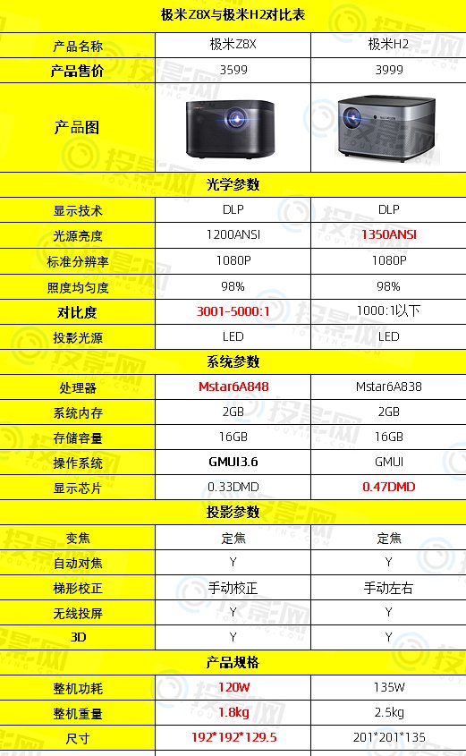 极米z8x和h2对比,h2亮度更高,z8x的对比度数值相对更高;||在芯片上,z8x的处理器比h2性能更强,h2的显示芯片比z8x更大;||产品规格上,z8x的整体功耗每种亮和尺寸都比h2小。